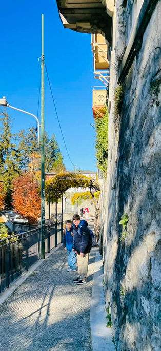 The main square is filled with cozy cafés and inviting restaurants, perfect for lingering over coffee while soaking up the atmosphere. From there, we wandered through winding lanes and had the choice to hike up to the famous lighthouse, Faro Voltiano, or take a quieter mountain path that opened up to breathtaking vistas of the valley and lake below.